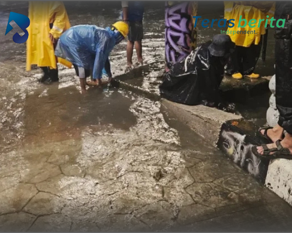 Di tengah hujan, petugas tetap bekerja membersihkan saluran dari sampah dan endapan lumpur. Mereka membuka penutup selokan, mengangkat sedimentasi, hingga turun langsung ke dalam got untuk memastikan tidak ada sumbatan.